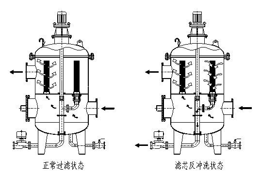 正常過(guò)濾狀態(tài):排污口閥門(mén)關(guān)閉。取自自然的江水、河水由濾水器上腔進(jìn)水口進(jìn)入,水中的塑料泡沫、樹(shù)枝、水草以及直徑大于隔板欄污柵孔徑的顆粒留在濾水器上腔,并由上排污閥排出。較為清潔的水經(jīng)導(dǎo)流管流至下腔,水到下腔后,一些沙?沙恋降装宄辽呈覂(nèi),沙?捎蓻_排泥沙出口排出。下腔的水從下隔板的孔流入V形楔式不銹鋼過(guò)濾網(wǎng)管,過(guò)濾后的清潔水從濾水器中間的出水口流出。